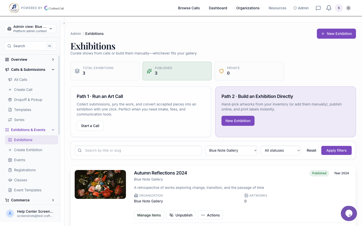 Exhibitions showcase accepted submissions and make them available for viewing, purchase, and public discovery. Crafted Call makes it seamless to create an exhibition directly from completed calls or to build one independently.